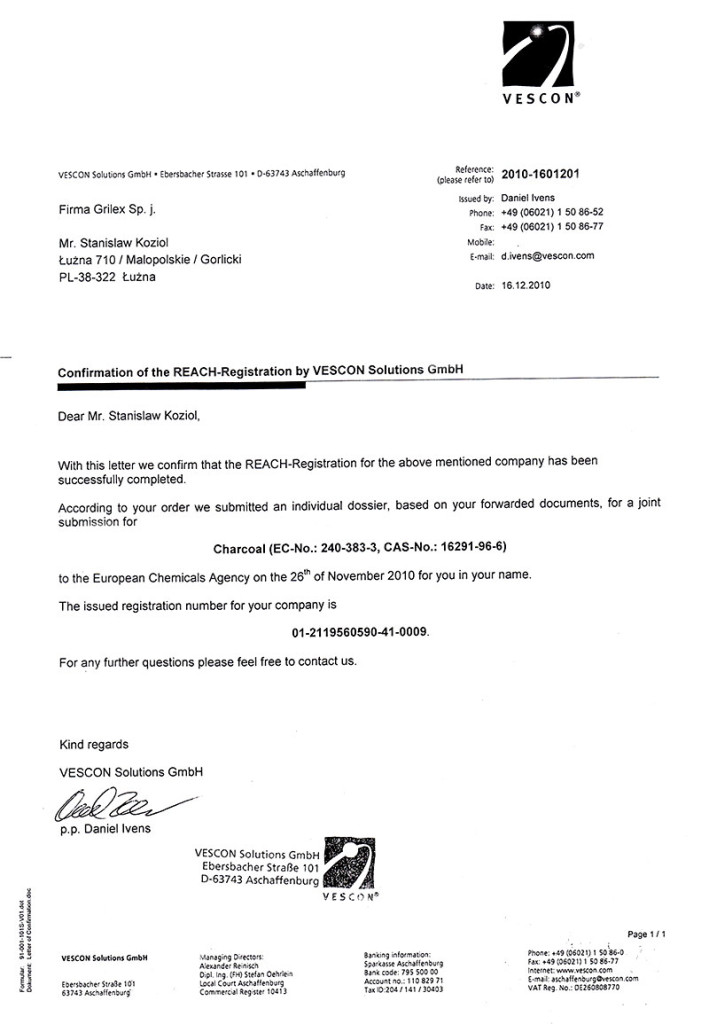 - We are registered in REACH(ECHA) which allows us to legally introduce our products on European Union market.